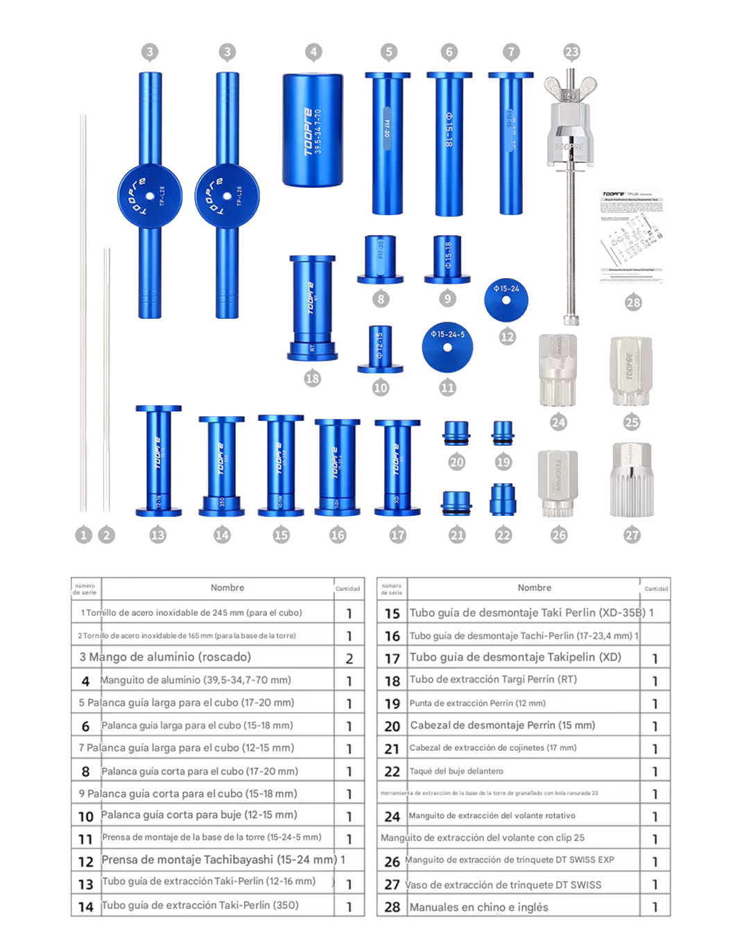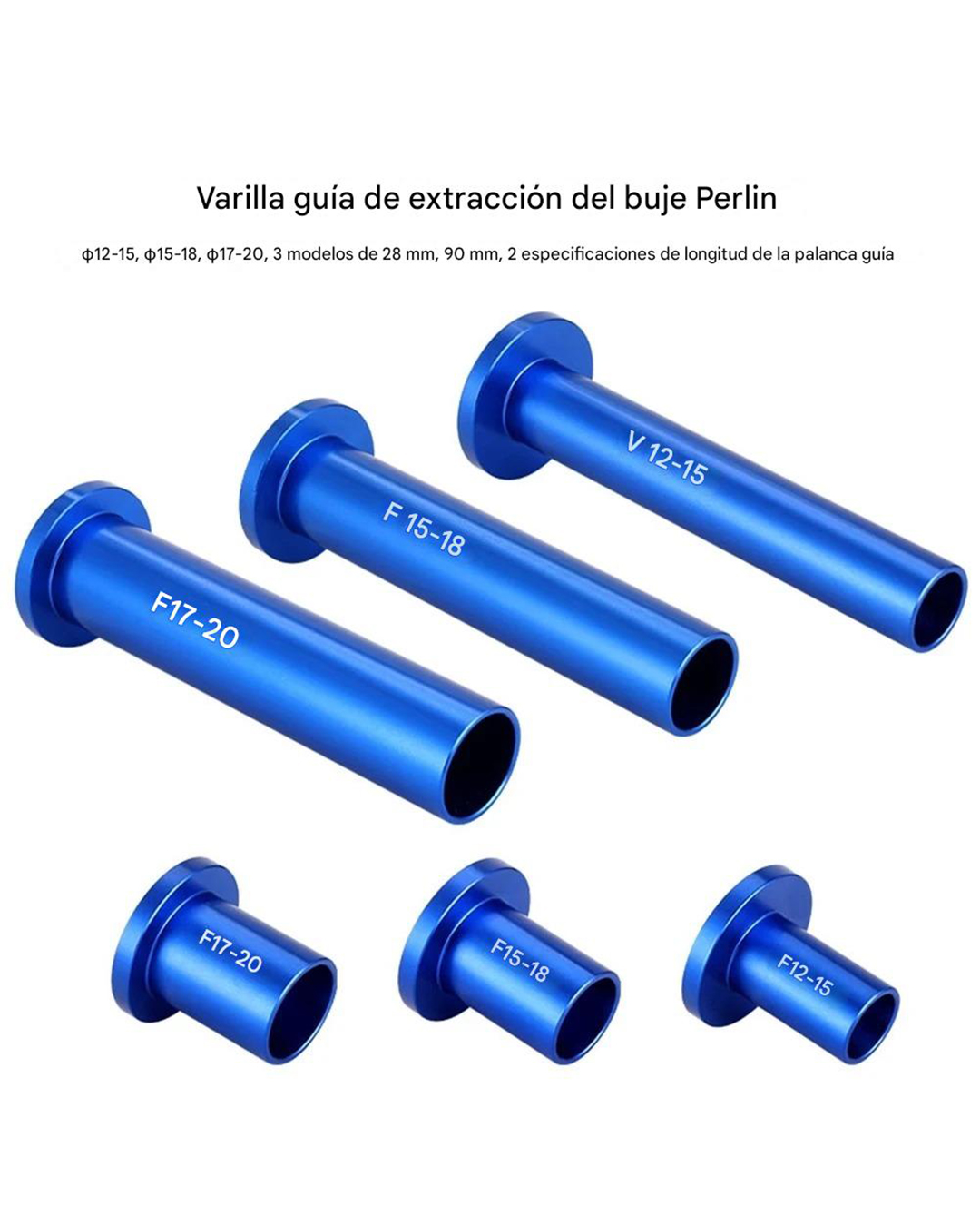 - Componentes Incluidos: Mangos, casquillos, varillas guía (largas y cortas), tubo de desmontaje, bloques de prensa y tapa superior